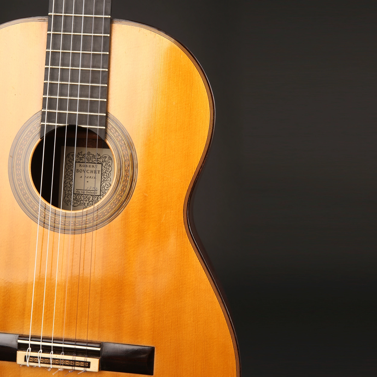 로베르 부쉐는 토레스 이후 20세기의 가장 영향력 있는 제작자 중 한 명으로 클래식 기타 역사상 가장 잘 알려져 있고 가장 중요한 기타 제작가이며, 오늘날 프랑스 기타 제작 계의 창시자이다. 그는 도제나 가구 제작 경력을 가지고 있는 대부분의 기타 제작가와는 다르게 화가이자 예술가였다. 기타 연주를 좋아하던 부쉐는 세계 2차대전 중에 소장했던 기타가 도난당하는 사건을 계기로 자신만의 악기를 만들게 된다. 파리에서 제작 활동을 하던 스페인 제작가 줄리안 고메즈 라미레즈(Julian Gomez Ramirez) 공방에서 기타 제작의 과정을 견습한 이후 그는 자신만의 고유하고 프랑스 적인 기타 소리를 연구하기 시작했다.
