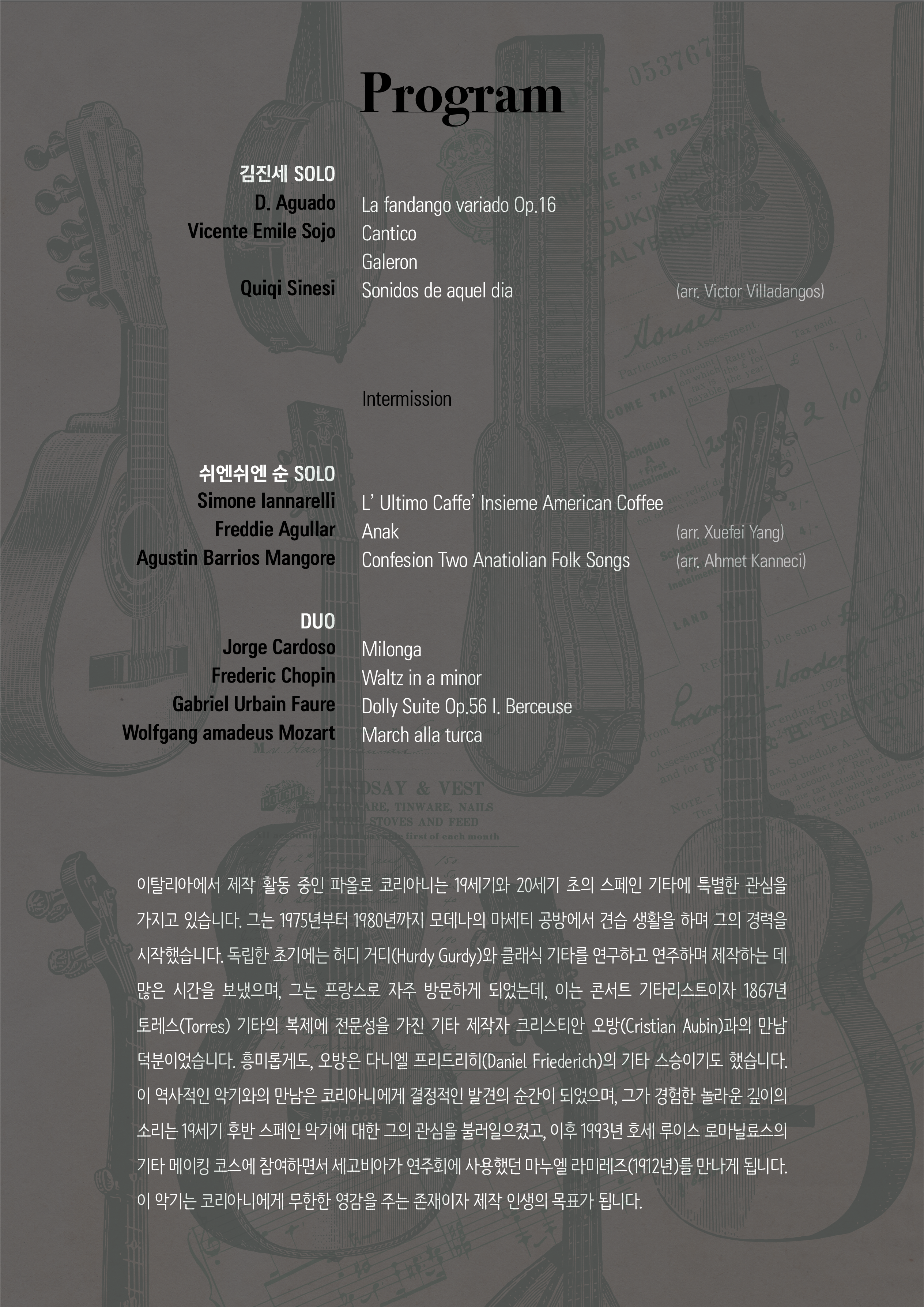 이탈리아에서 제작 활동 중인 파올로 코리아니는 19세기와 20세기 초의 스페인 기타에 특별한 관심을 가지고 있습니다.