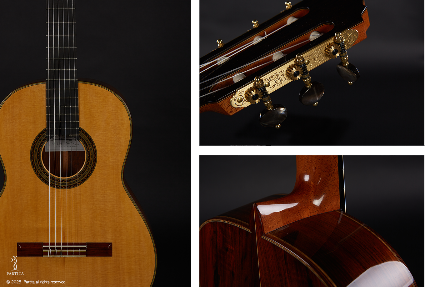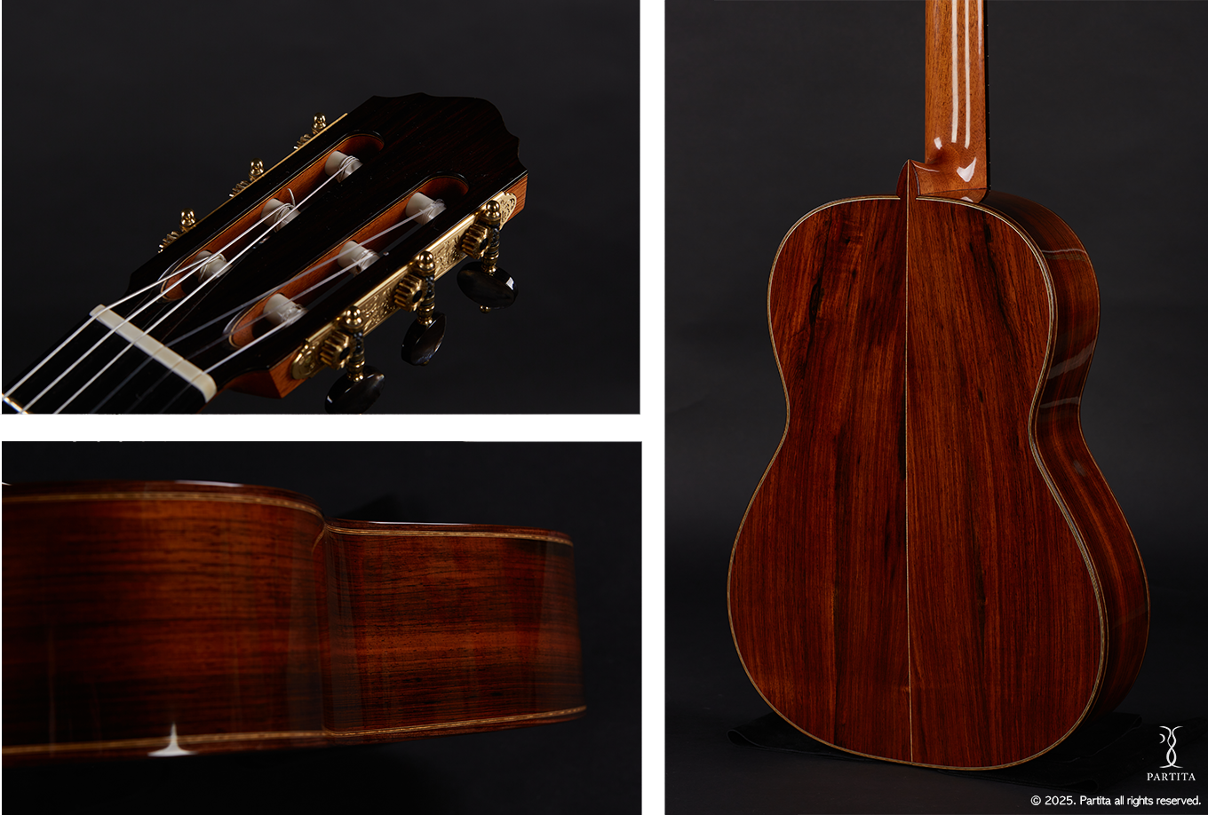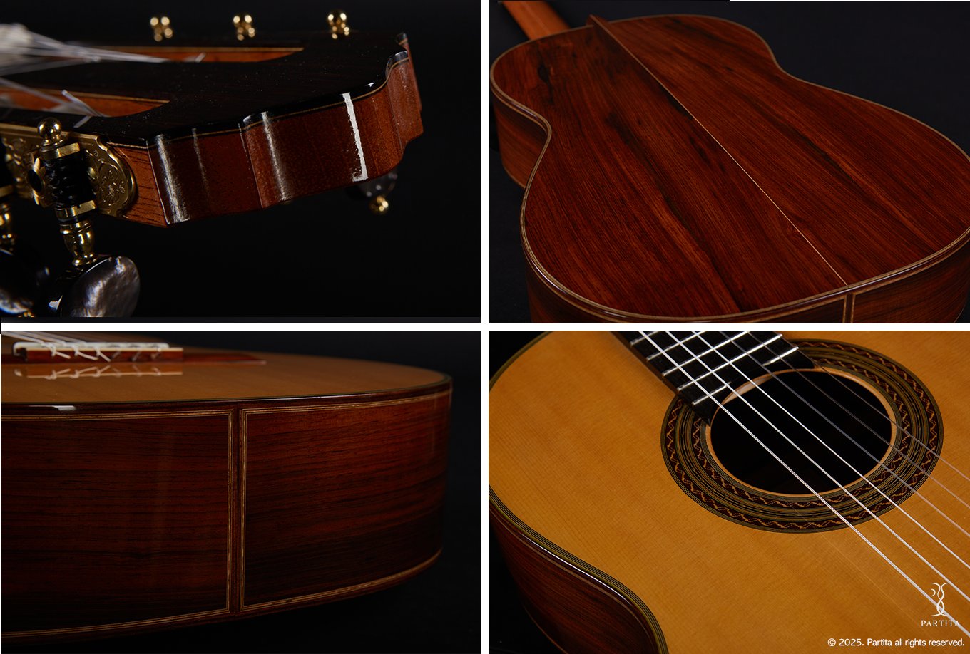 전통적인 기타의 음색과 더불어 파워풀한 소리가 매우 매력적인 기타이며 2020년 처음 로마 엑스포에서 출품했던 작품입니다. 오직 파르티타에서만 선보이는 제작가의 유일한 설계 메커니즘이 적용된 특별한 악기입니다.
