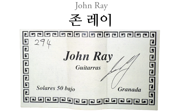캐나다에서 태어난 존 레이는 1989년 기타를 만들기 위해 그라나다에 자리를 잡았습니다. 그는 그라나다가 세계적인 기타 장인들이 모인 중심지라는 것을 알게 됐고, 현지 루시어들로부터 많은 것을 배울 수 있었습니다. 조나단 힌베스, 호세 에인절 차콘, 안토니오 마린의 스승으로부터 훌륭한 수업을 받았고 특히 그라나다로 이민 온 독일의 기타 제작자이며 친구인 롤프 아이칭거의 아낌없는 지원과 지도로 기타 제작에 전념할 수 있었습니다. 게다가 존은 미겔 로드리게스, 비센테 아리아스, 마누엘 라미레스, 살바도르 이바녜스와 같은 위대한 거장들이 만든 많은 기타를 복원했습니다.