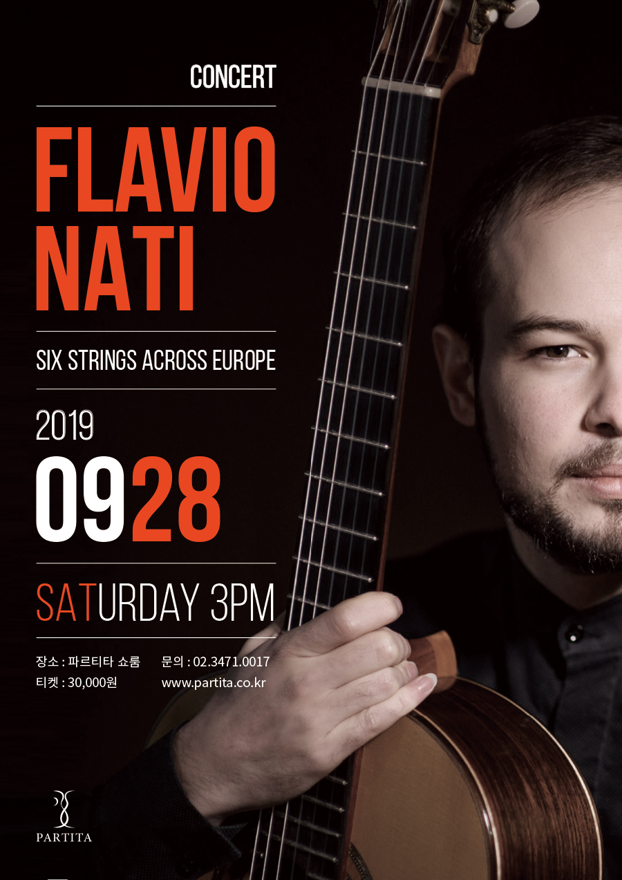 이탈리아의 젊은 클래식기타리스트 Flavio Nati 플라비오 나티가 파르티타를 방문합니다. 원숙함과 다양성, 높은 퀄리티의 연주로 평가받고 있는 플라비오 나티의 공연은 19세기-20세기의 마스터피스 기타곡으로 구성됩니다. 9월 마지막주 토요일 오후, 파르티타에서 준비한 애프터눈티와 함께 특별한 공연을 기대해 주세요.