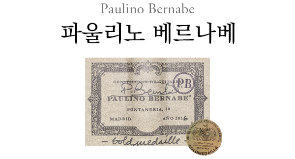 스페인 마드리드의 기타 제작가 파울리노 베르나베는 기타 제작가들 사이에선 엘리트로 통합니다. 그는 원래 기타 연주자를 꿈꾸던 사람으로, 타레가의 제자인 다니엘 포르테아와 함께 기타 레슨을 받았지만 이 기간 동안 기타를 만드는 데 더 큰 흥미를 느끼고 기타 제작의 도제생활을 시작하게 되었습니다. 경험과 실력이 쌓여감에 따라 유명한 라미레즈의 공방 수석 장인의 자리에 오를 수 있게 되었는데 바로 기타리스트 세고비아가 라미레즈의 기타를 사용하기 시작하던 때였습니다. 37세가 되던 1969년, 베르나베는 라미레즈 공방을 나와 마침내 마드리드에 자신의 이름을 내건 공방을 차리게 되었습니다.