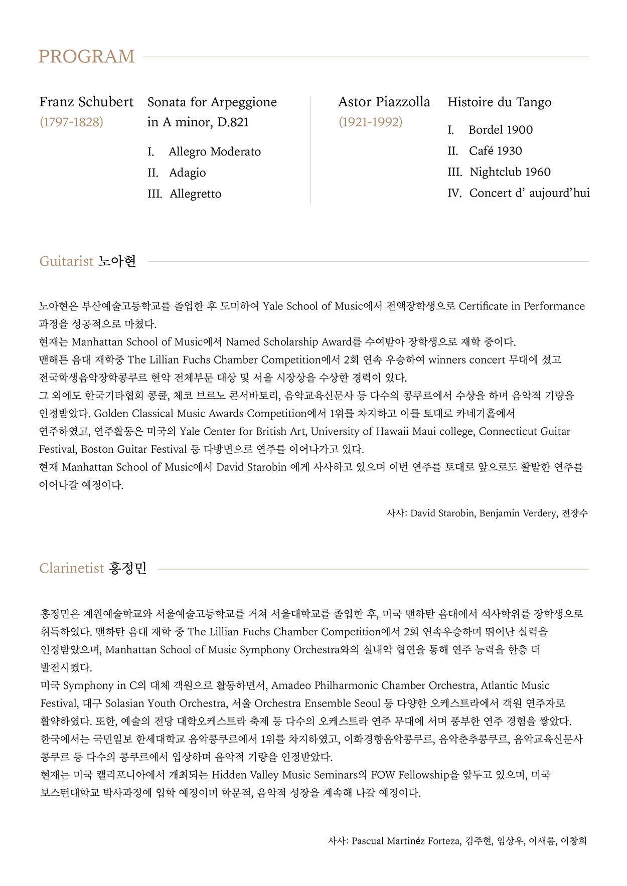 한국의 차세대 유망한 두명의 한국인 연주자가 만난 특별한 무대이다. 기타와 클라리넷의 만남, 기타리스트 노아현과 클라리네티스트 홍정민은 현재 미국에서 유학생활을 하고 있는 학생들이다. 노아현은 부산예고를 졸업후 도미하여 예일 음대에서 전문 연주자 과정과 맨하탄 음대에서 학사과정을, 홍정민은 서울예고와 서울대를 졸업후 맨하탄 음대에서 석사를 마치고 보스턴 대학에서 박사 과정 중에 있다.